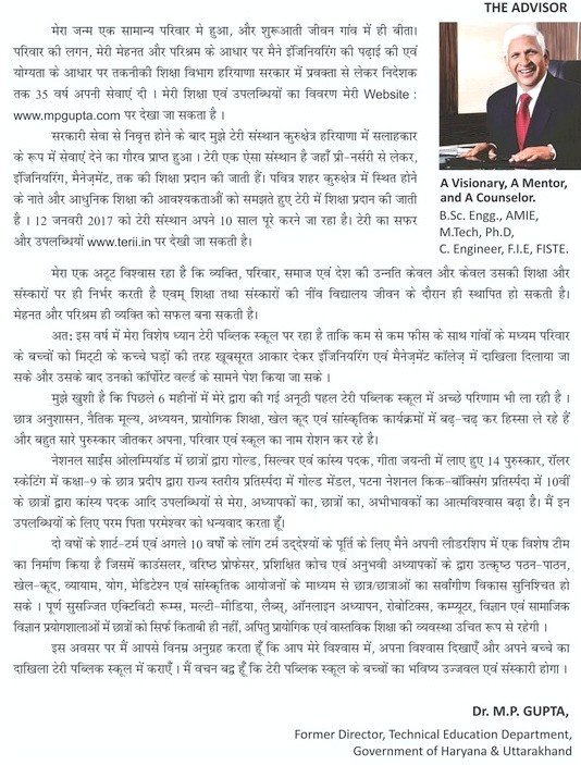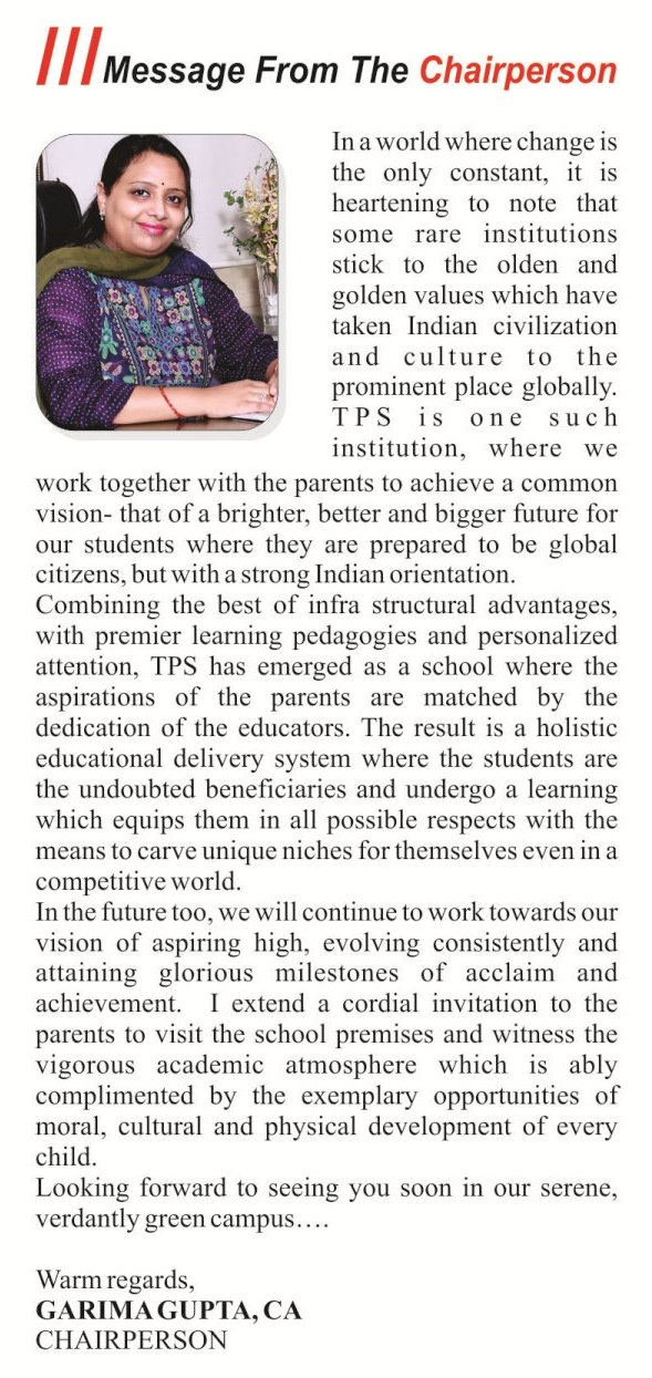I do appreciate & respect the dreams and expectations with which parents place their most precious ones into my lap. I commit to make the students climb the mountains to let them view the plane that too without putting much of financial burden on the pocket of the parents as the fee/ charges of TERI Public School are quite reasonable.